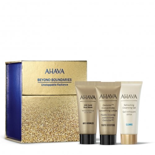 Atraskite prabangų veido priežiūros ritualą su AHAVA BEYOND BOUNDARIES UNSTOPPABLE RADIANCE dovanų rinkiniu. Rinkinyje – trys profesionalios priemonės: 24K aukso mineralinė purvo kaukė, odos tekstūrą gerinantis Osmoter™ losjonas ir gaivinantis veido prausiklis. Kiekvienas produktas sukurtas naudojant Negyvosios jūros mineralus, kurie maitina, drėkina ir saugo odą nuo aplinkos poveikio. Idealu brandžiai, pavargusiai ar spindesį praradusiai odai.