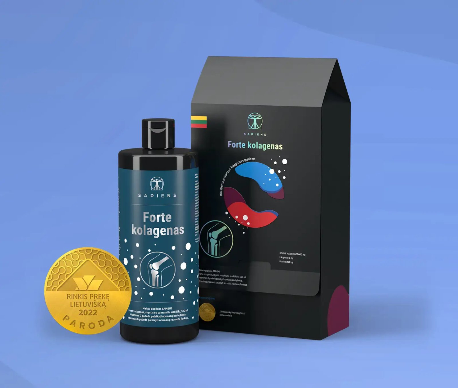 Pripažinimo sulaukęs Forte kolagenas 2022 m. spalio 7 d. „RINKIS PREKĘ LIETUVIŠKĄ“ pelnė aukso medalį. Parodos metu yra pristatomi iškiliausių Lietuvos gamintojų pasiekimai, nauji prekės ženklai ir apdovanojimus pelnę gaminiai. Geriausių parodoje pristatomų gaminių konkurso tikslas yra įtvirtinti parodoje dalyvaujančių šalies gamintojų išskirtinius gaminius. SAPIENS Forte kolagenas (sąnariams su vit. D) puikuojasi tarp kitų aukso medaliais apdovanotų Kosmetikos ir buitinės chemijos kategorijos 2022 metų laureatų.