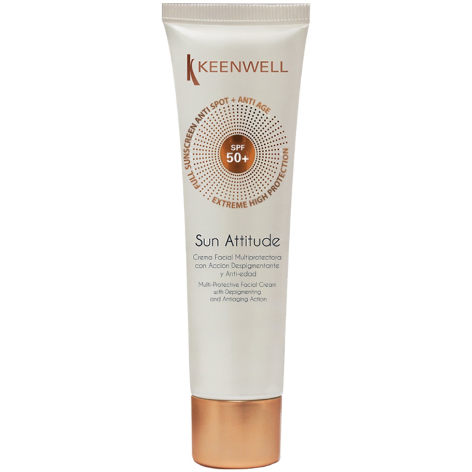 KEENWELL SUN ATTITUDE SPF 50 veido kremas – depigmentuojantis ir prieš odos senėjimą veikiantis kremas su aukšta apsauga nuo saulės, antioksidantais ir regeneruojančiomis veikliosiomis medžiagomis.
